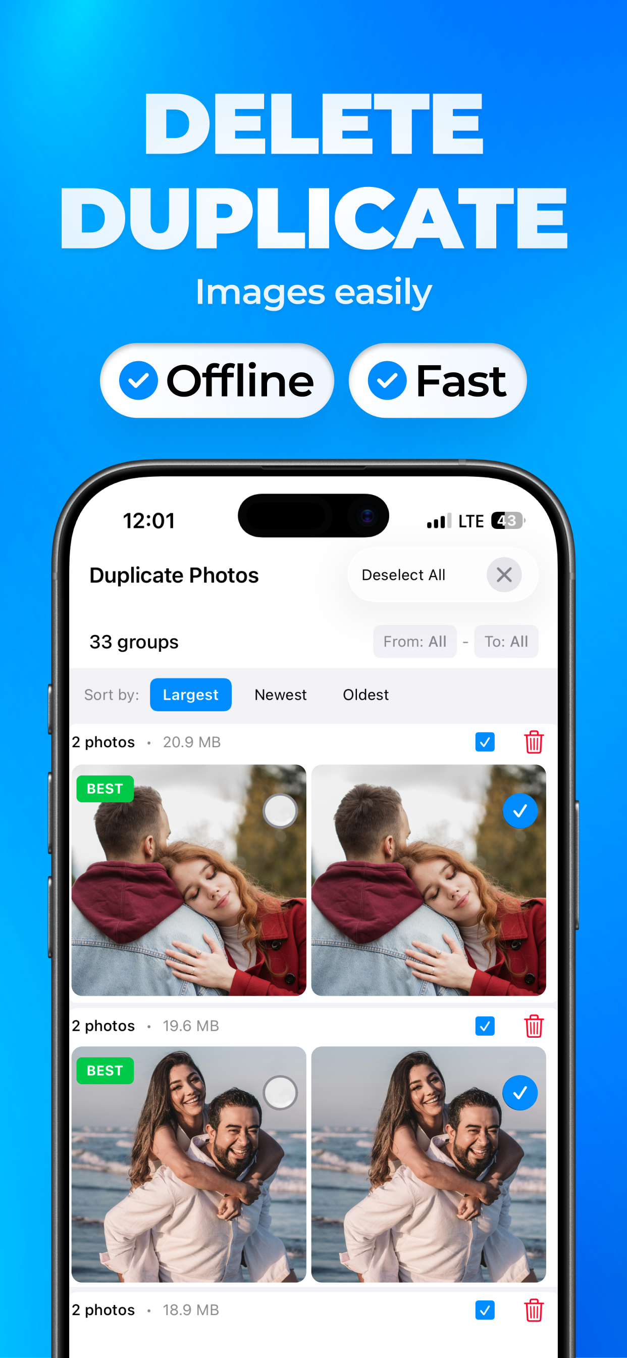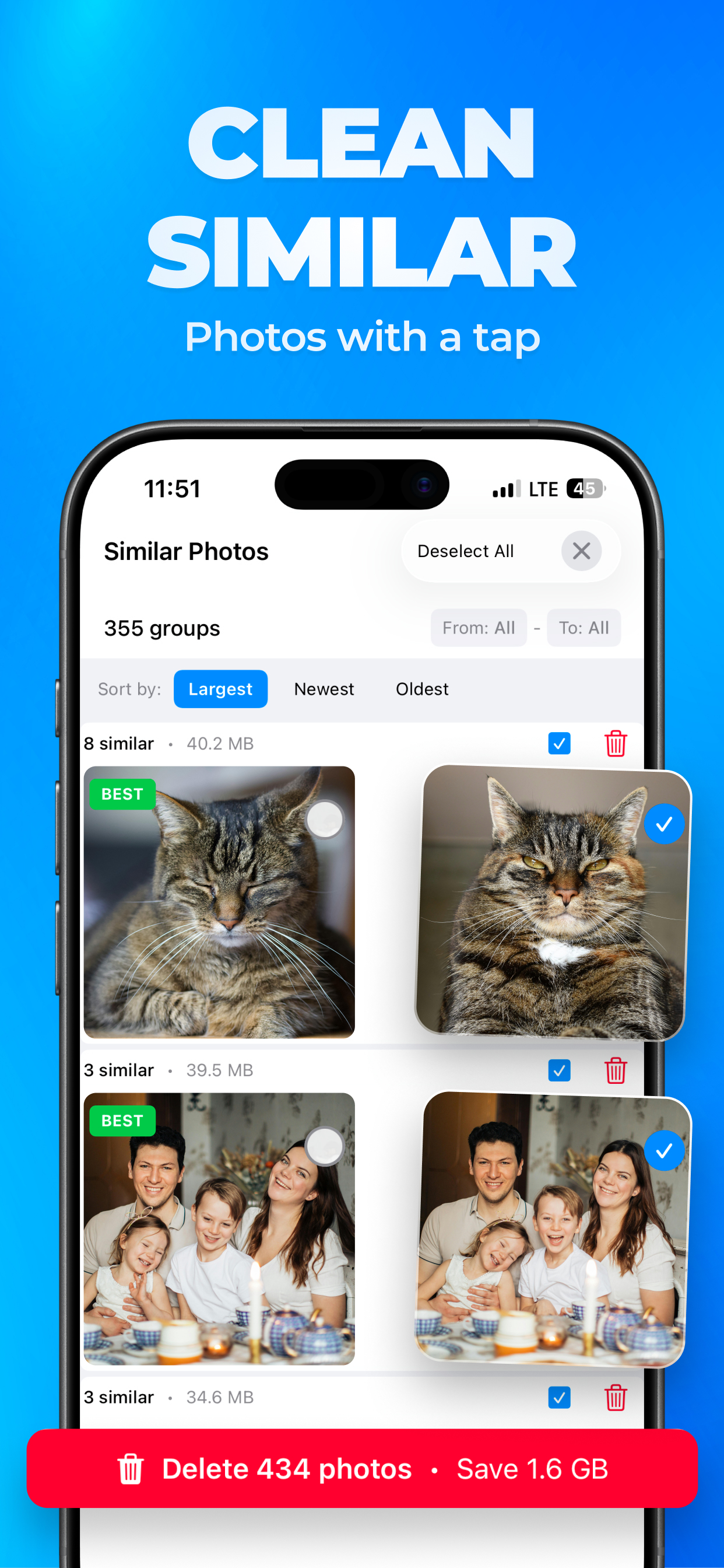 Took 20 shots to get the perfect one? The app groups visually similar photos together using AI-powered image analysis. It even identifies the best quality shot in each group based on sharpness, lighting, and composition—so you can confidently delete the rest.