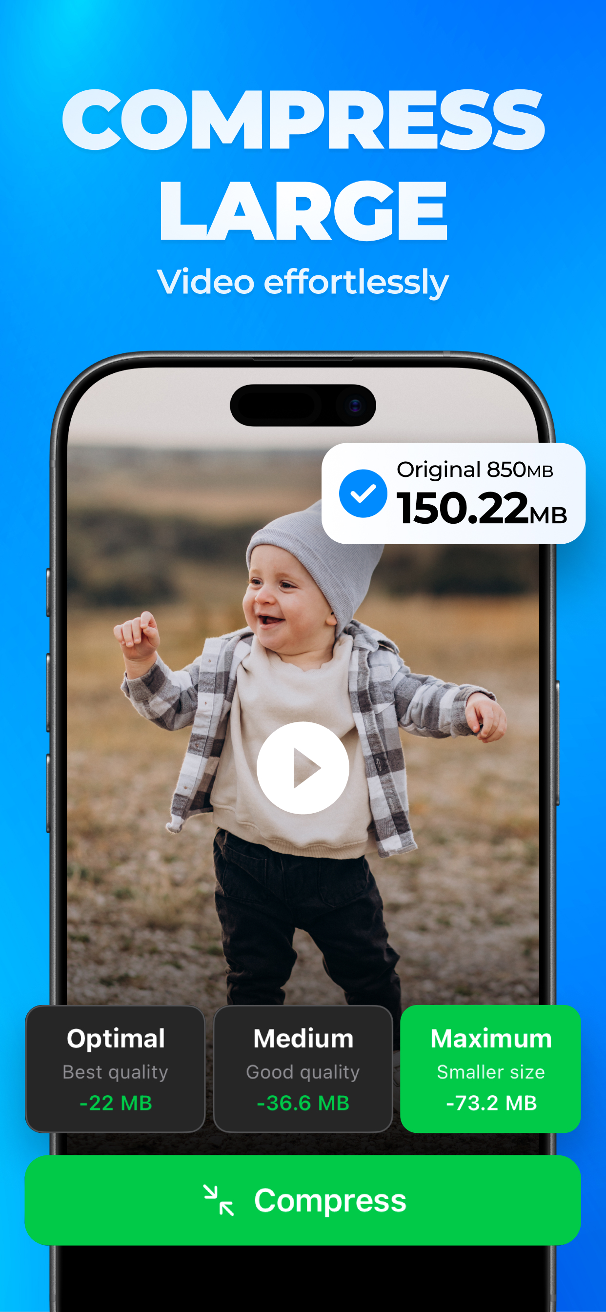 Videos eating up your storage? Compress them with smart quality-preserving algorithms that can reduce file sizes by up to 70% while maintaining visual quality. Choose from High, Medium, or Maximum compression levels based on your needs—all processed locally on your device.