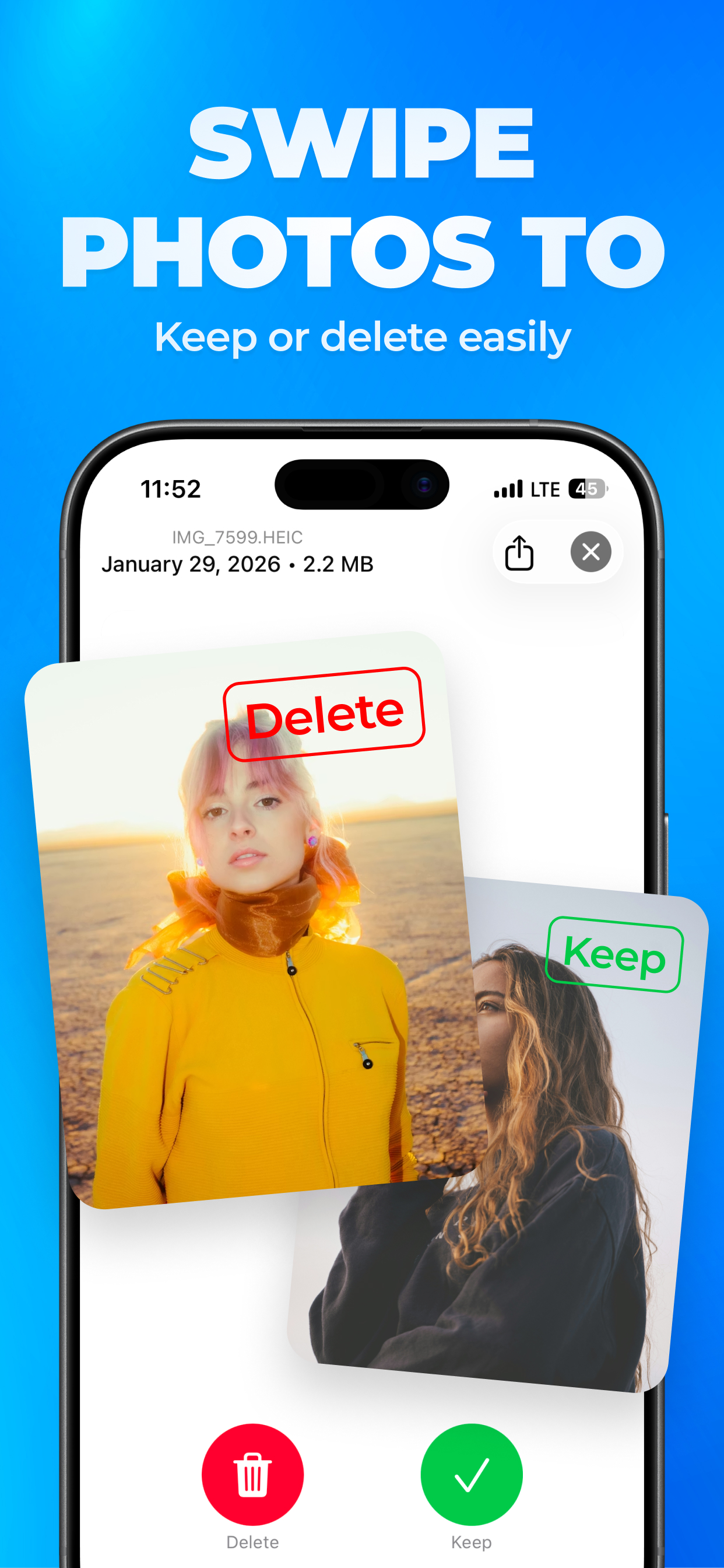 Review your entire photo library with a fun, addictive swipe interface. Swipe left to delete, swipe right to keep—it's like a dating app for your photos! Navigate by month to quickly find and clean specific time periods.